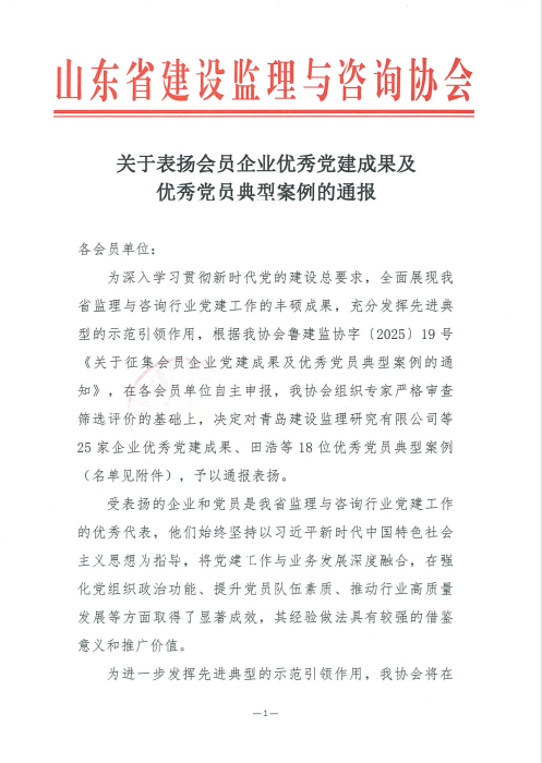 喜報(bào)!濟(jì)南監(jiān)理榮獲山東省建設(shè)監(jiān)理與咨詢協(xié)會“會員優(yōu)秀企業(yè)黨建成果”及“優(yōu)秀黨員典型案例”通報(bào)表揚(yáng)